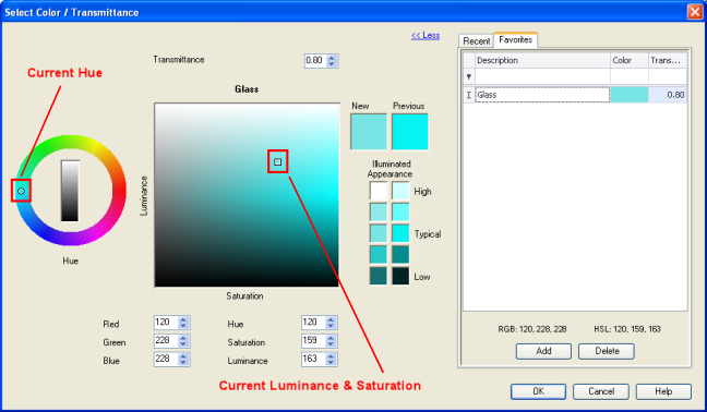 Set the transmittance by first selecting the Hue from the color wheel. Grayscale (monochromatic) Hues can be selected from the scale in the center of the wheel. Set the Luminance and Saturation of the Hue in the center square. Both selections are achieved by using a click and drag technique. Alternatively, a numeric value can be entered in the Transmittance cell at the top of the dialog.